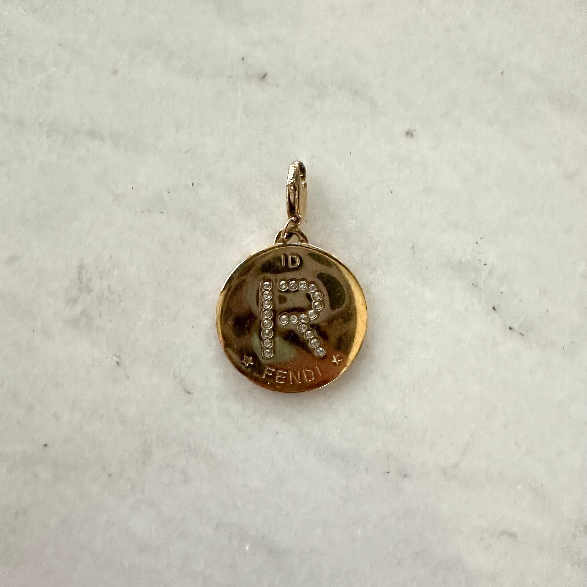 Fendi letter R. De bedel is vintage dus er kunnen gebruikssporen/ schade op zitten. De bedel word geleverd zonder ketting & is verguld.