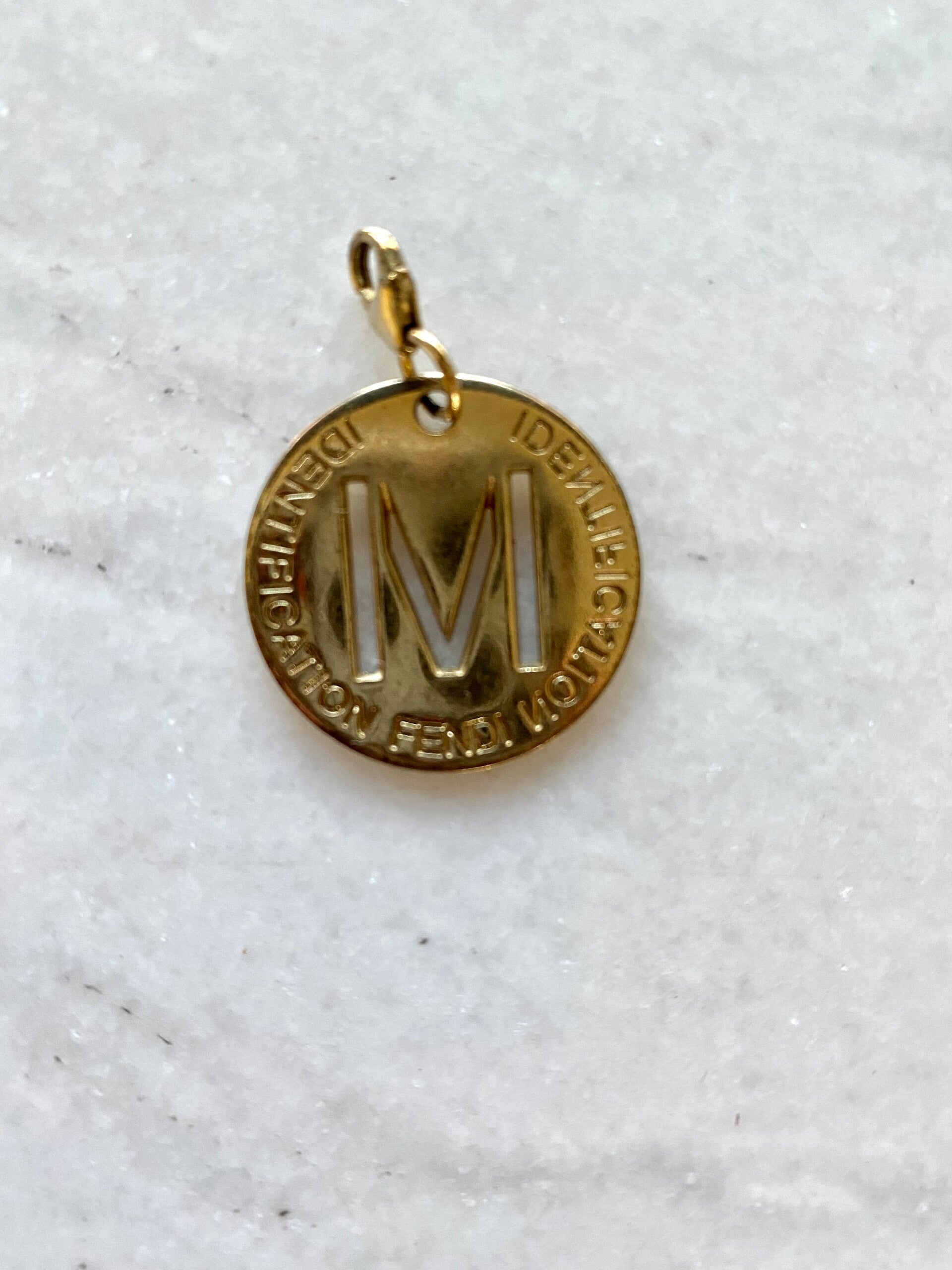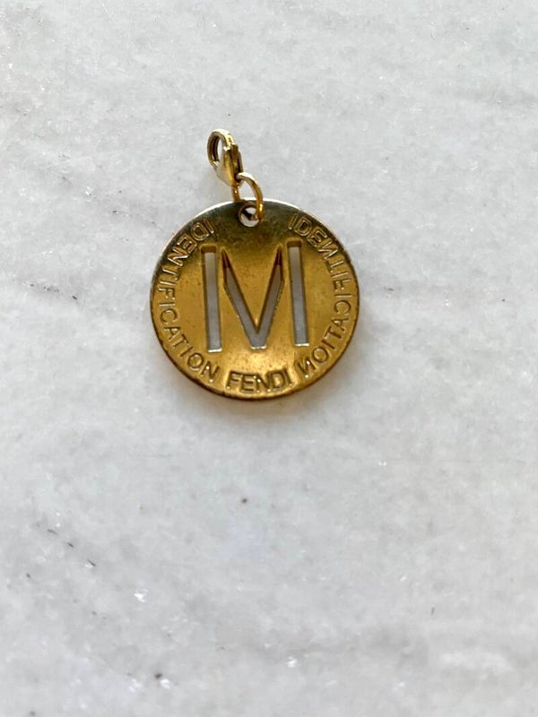 Fendi letter M. De bedel is vintage dus er kunnen gebruikssporen/ schade op zitten. De bedel word geleverd zonder ketting.