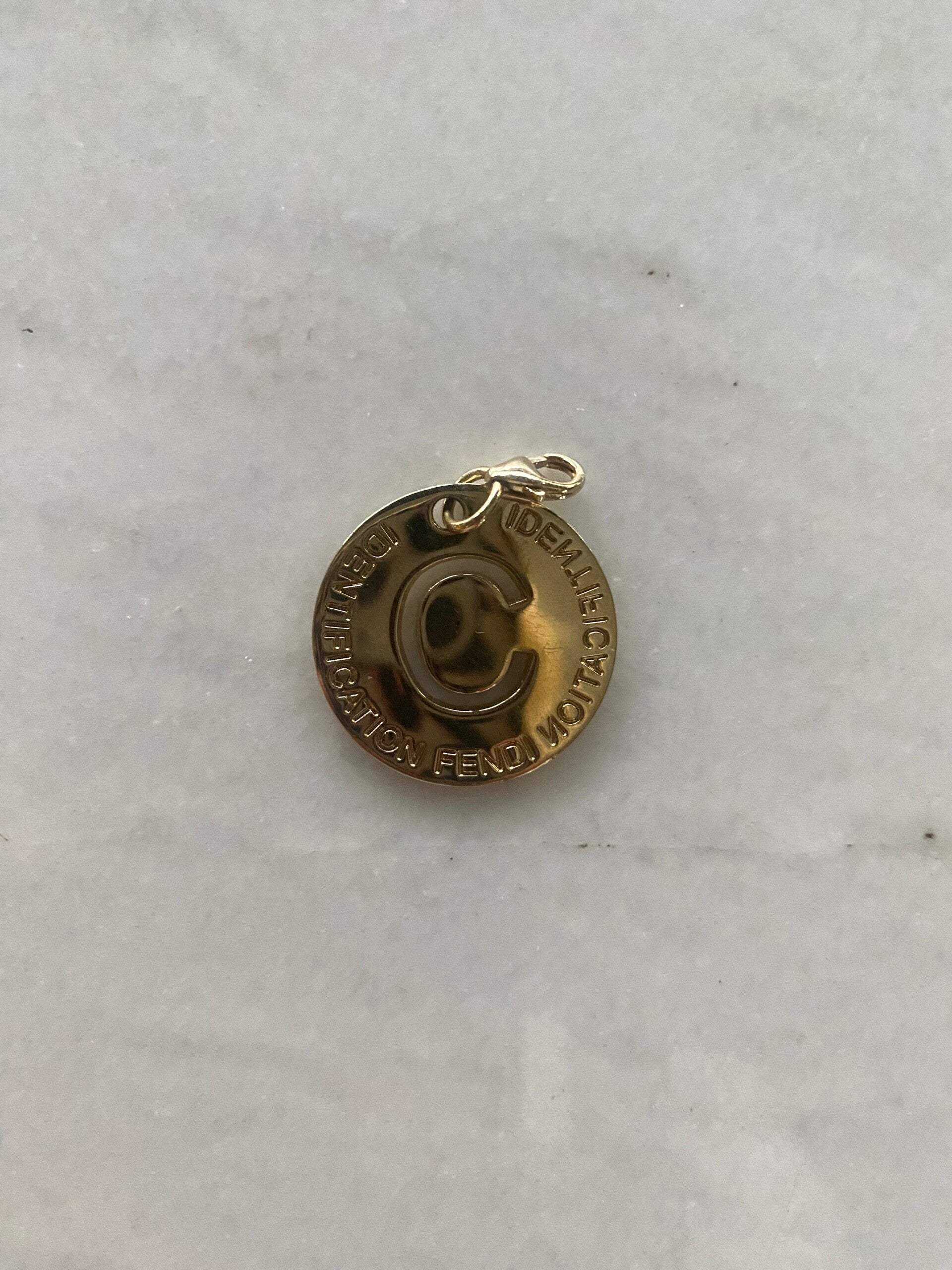 Fendi letter C. De bedel is vintage dus er kunnen gebruikssporen/ schade op zitten. De bedel word geleverd zonder ketting & is verguld.