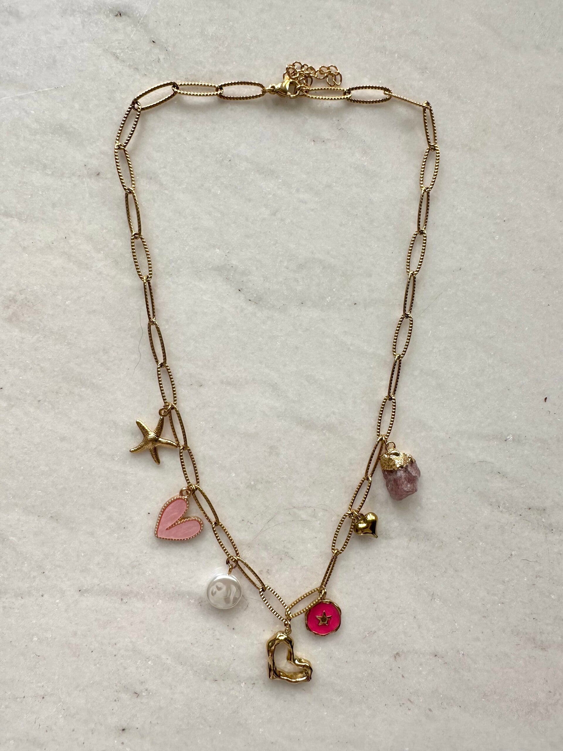 Mega leuke gouden charm necklace. De ketting is verstelbaar, RVS en past bij elke gelegenheid :)